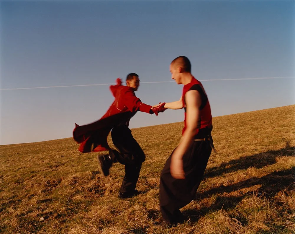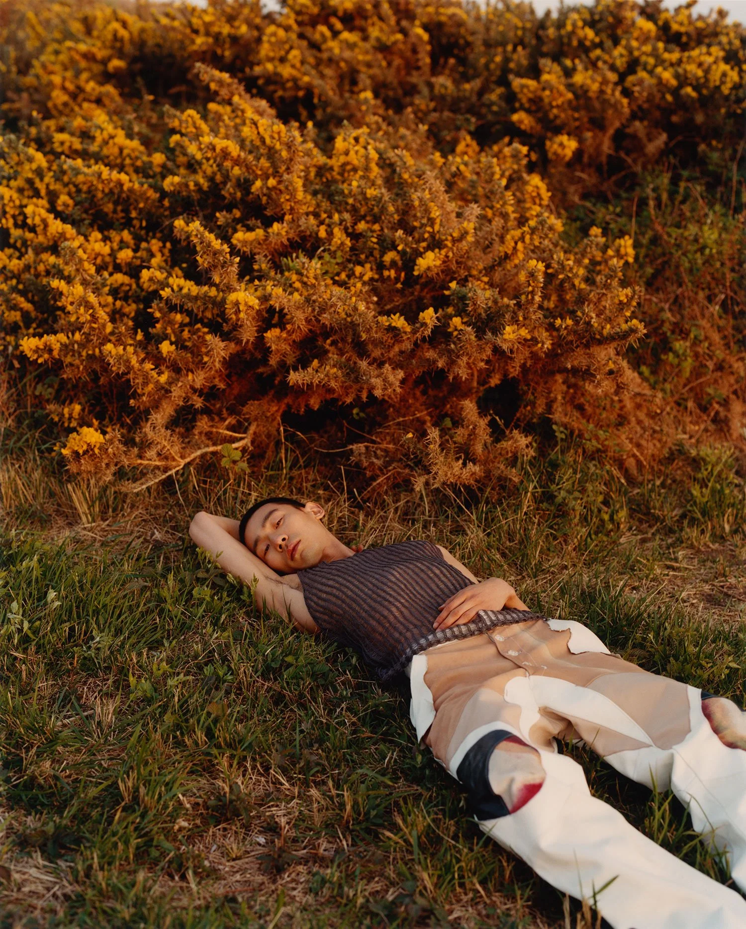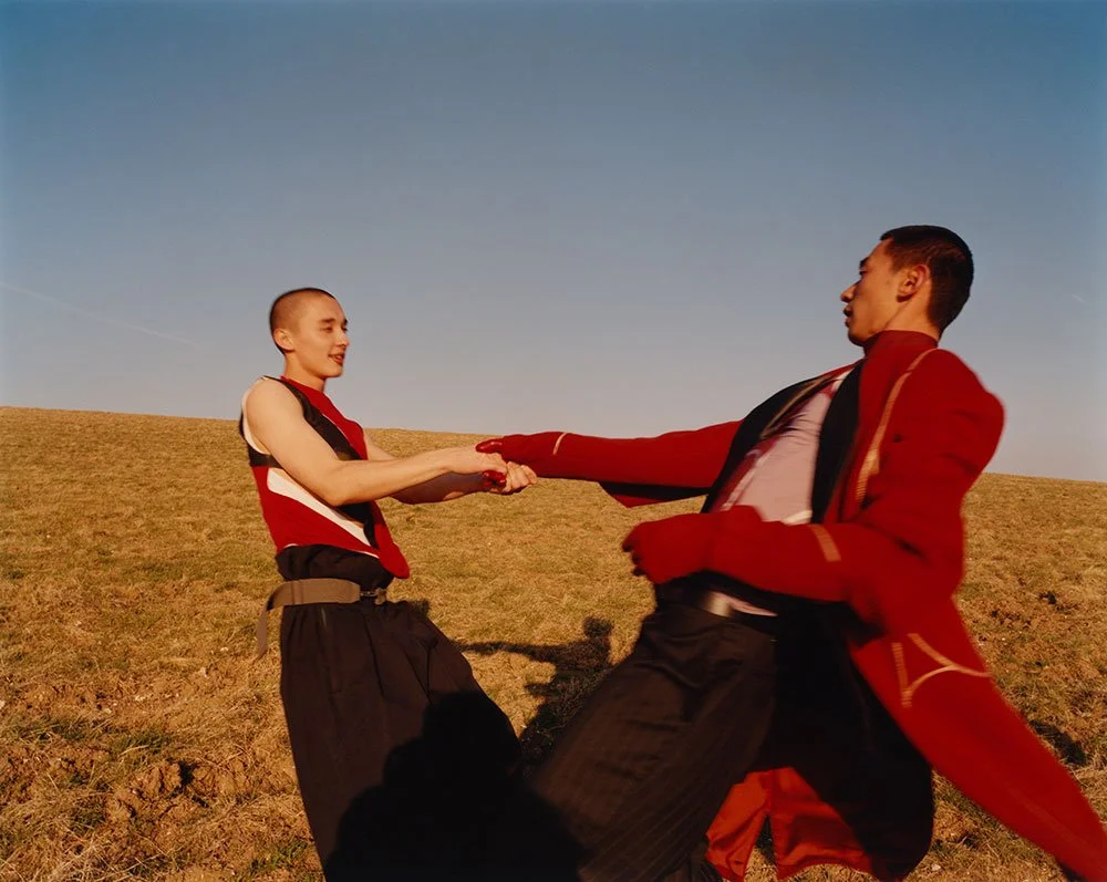 Zhuo wears jacket and turtleneck SAMUEL SLATTERY, trousers MASTERBUNNY.