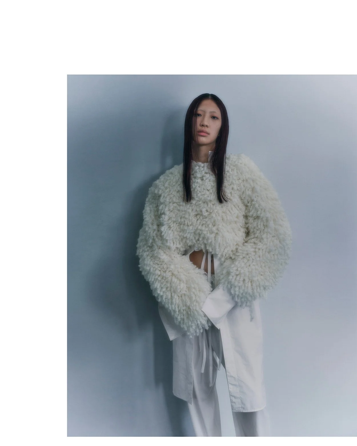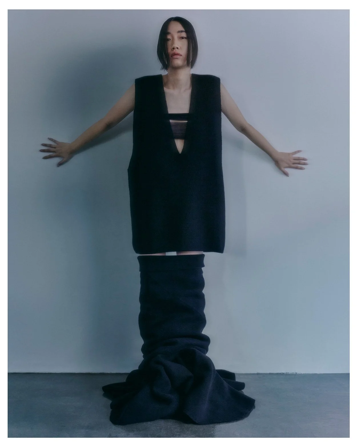 KOIKE wears sleeveless high-neck ANN DEMEULEMEESTER,