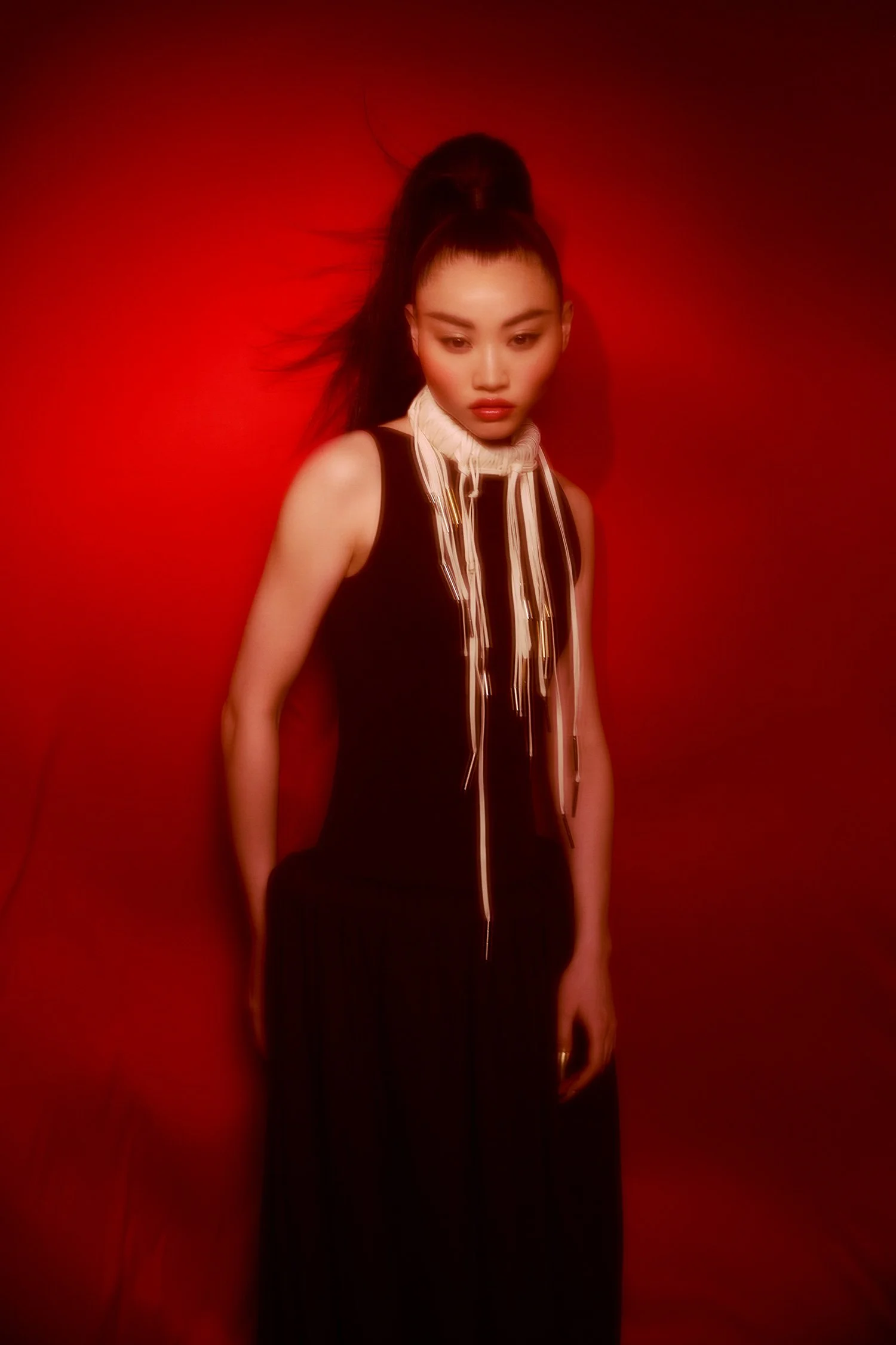 There is a sense of acceleration in the air, a shift from stillness to stride, where motion itself becomes declaration. Photographed by Eve J. Liu and directed alongside Arthur Woo, the imagery unfolds in scarlet light and shadow, embodying renewal defined not by return, but by propulsion toward what lies ahead.